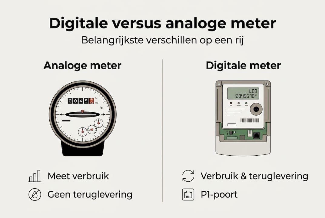 Een digitale meter is de opvolger van de oude analoge schijfmeter. Het grote verschil zit hem in hoe de meter meet. Een analoge meter registreert alleen het totale verbruik. Een digitale meter meet verbruik en teruglevering apart, wat essentieel is als je zonnepanelen hebt.