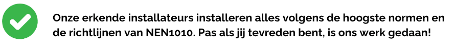 Onze erkende installateur installeert alles volgens de hoogste normen en de richtlijnen van NEN1010. Na de installatie controleren we alles grondig en zorgen we ervoor dat alles naar behoren werkt. Pas als jij tevreden bent, is ons werk gedaan!