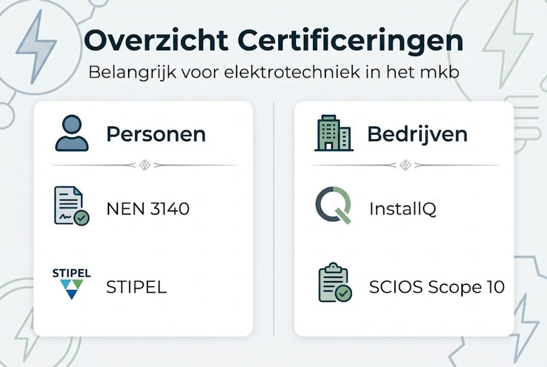 Elektrotechnische certificering bestaat uit twee lagen. De eerste laag betreft de vakbekwaamheid van de elektricien zelf: heeft hij of zij de juiste opleiding, examens en bevoegdheden? De tweede laag gaat over de installatie: voldoet die aan de geldende normen en is dat aantoonbaar vastgelegd? Beide lagen zijn noodzakelijk voor een veilig en verzekerd bedrijf.