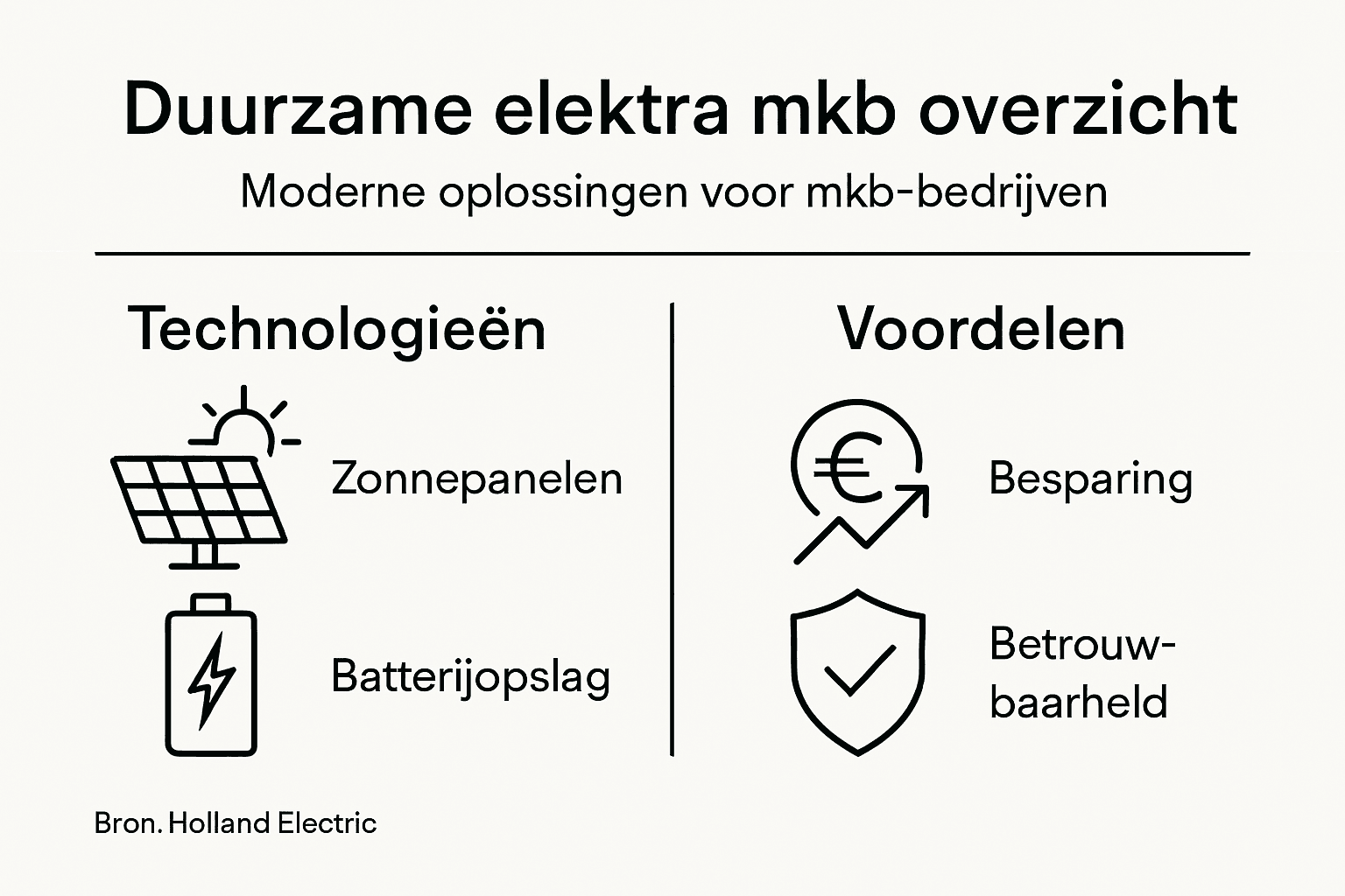 Hieronder zie je een handig overzicht van belangrijke technologieën voor toekomstbestendige elektra en hun unieke waarde voor mkb’ers: