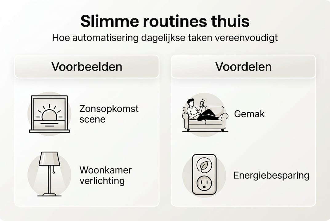 Deze besparingen komen door slimme automatisering. Een slimme thermostaat verwarmt alleen wanneer je thuis bent en leert je schema kennen. Hij detecteert open ramen en schakelt de verwarming automatisch uit. Slimme verlichting past helderheid aan op basis van daglicht en schakelt uit in lege kamers. Deze kleine aanpassingen tellen op tot grote besparingen.